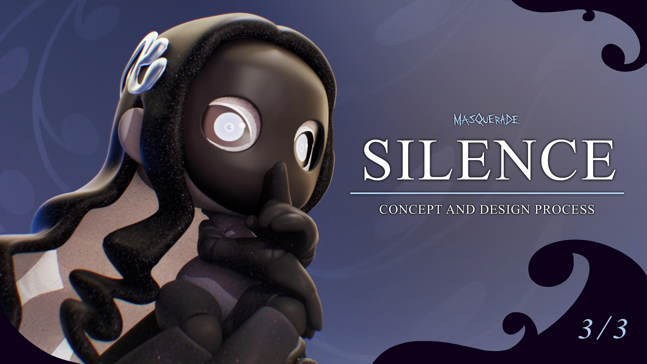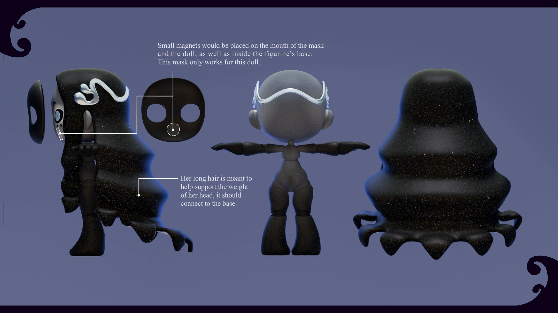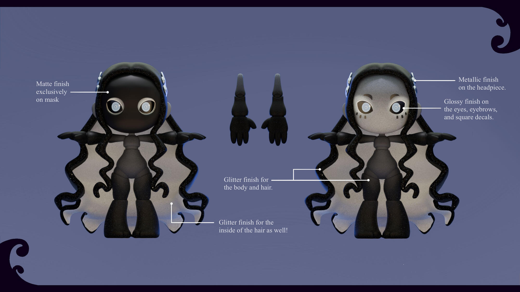 This one was interesting.From the start we were adamant on using a specific mask -- the moretta mask. Something about it just... felt right.The mask demanded dark tones to match. Even if we tried doing some lighter versions, the only places white could be introduced were those that accentuated how dark everything else was. Everything else looked wrong.Silence didn't feel like a doll that would have a lot of moving parts or stood out from the start. We wanted her to be simple, but capable of capturing your full attention. Well, what keeps a human's attention better than the eyes of another?With that focal point in play, we got to work on figuring out how to best accompany it.While thinking, the only thing that kept going through our heads were the words: A cold gazed, "queen of the night" -esque, void that stares back. That, eventually, took us to the night sky and the shine of freshly fallen snow -- and that's when the solution came to us. We needed to add glitter.
