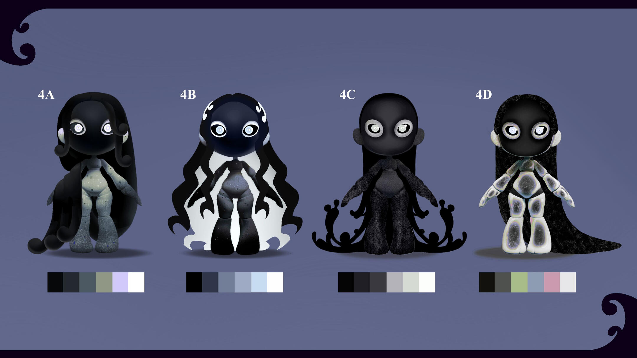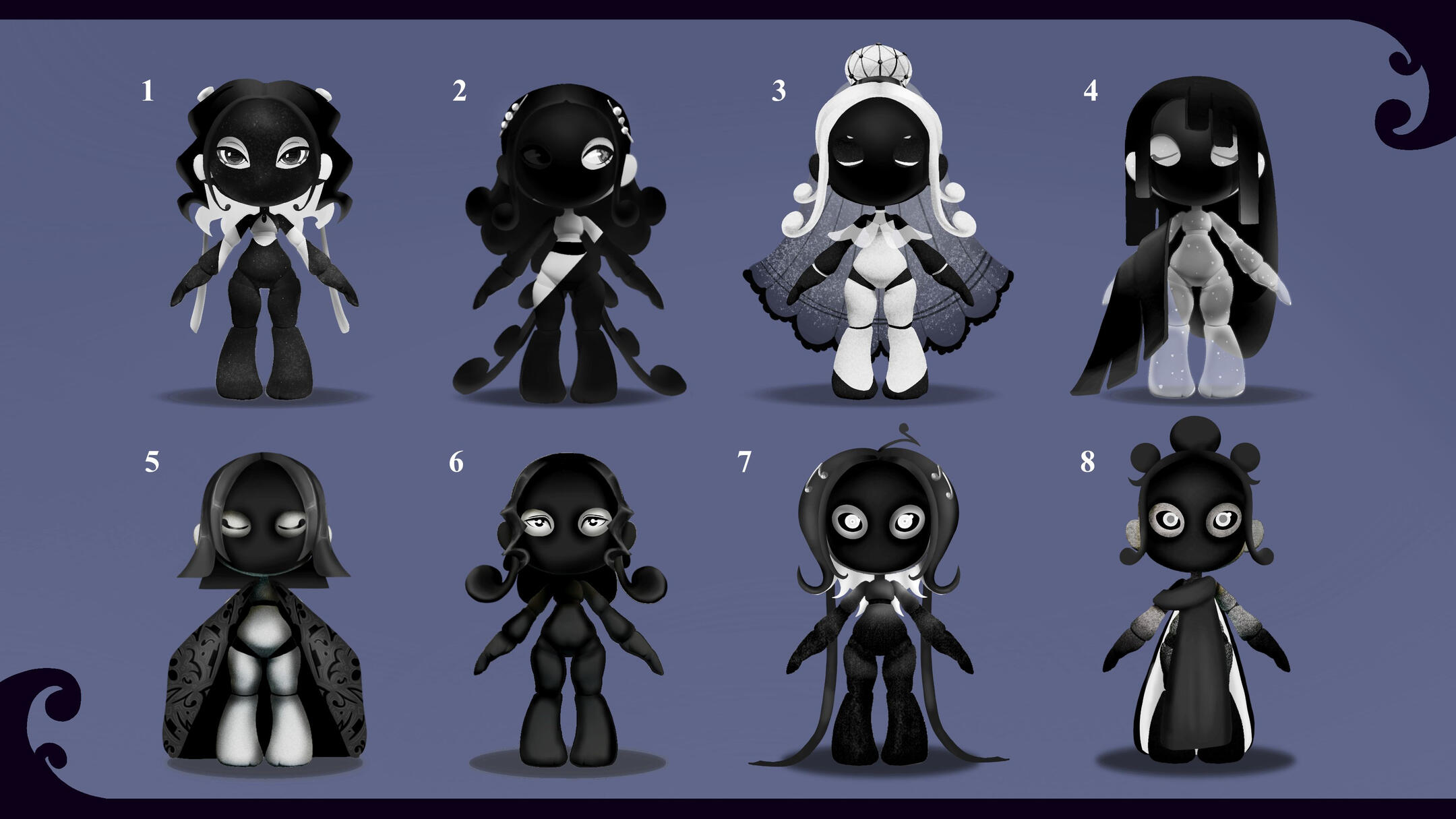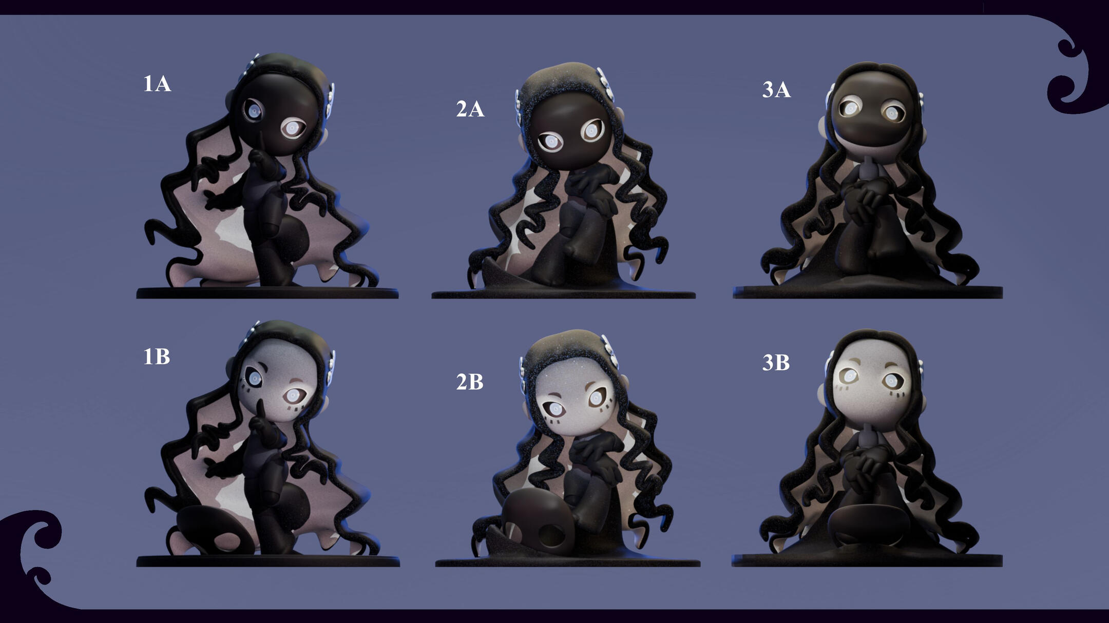 This one was interesting.From the start we were adamant on using a specific mask -- the moretta mask. Something about it just... felt right.The mask demanded dark tones to match. Even if we tried doing some lighter versions, the only places white could be introduced were those that accentuated how dark everything else was. Everything else looked wrong.Silence didn't feel like a doll that would have a lot of moving parts or stood out from the start. We wanted her to be simple, but capable of capturing your full attention. Well, what keeps a human's attention better than the eyes of another?With that focal point in play, we got to work on figuring out how to best accompany it.While thinking, the only thing that kept going through our heads were the words: A cold gazed, "queen of the night" -esque, void that stares back. That, eventually, took us to the night sky and the shine of freshly fallen snow -- and that's when the solution came to us. We needed to add glitter.