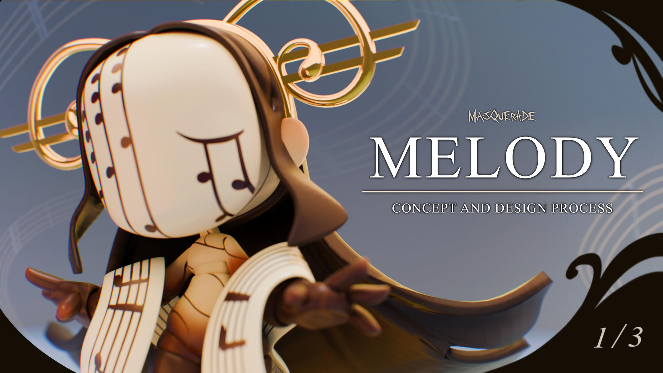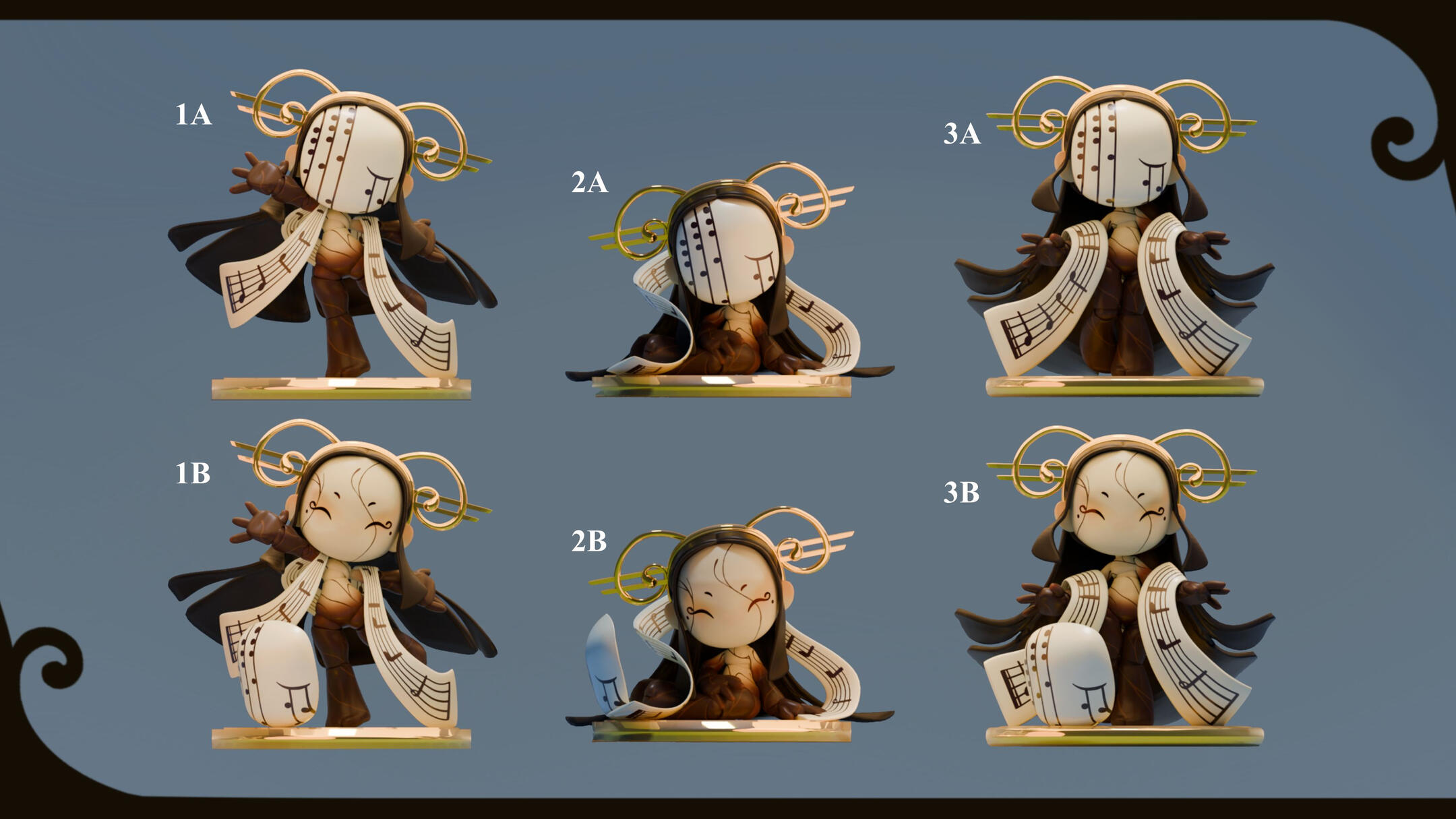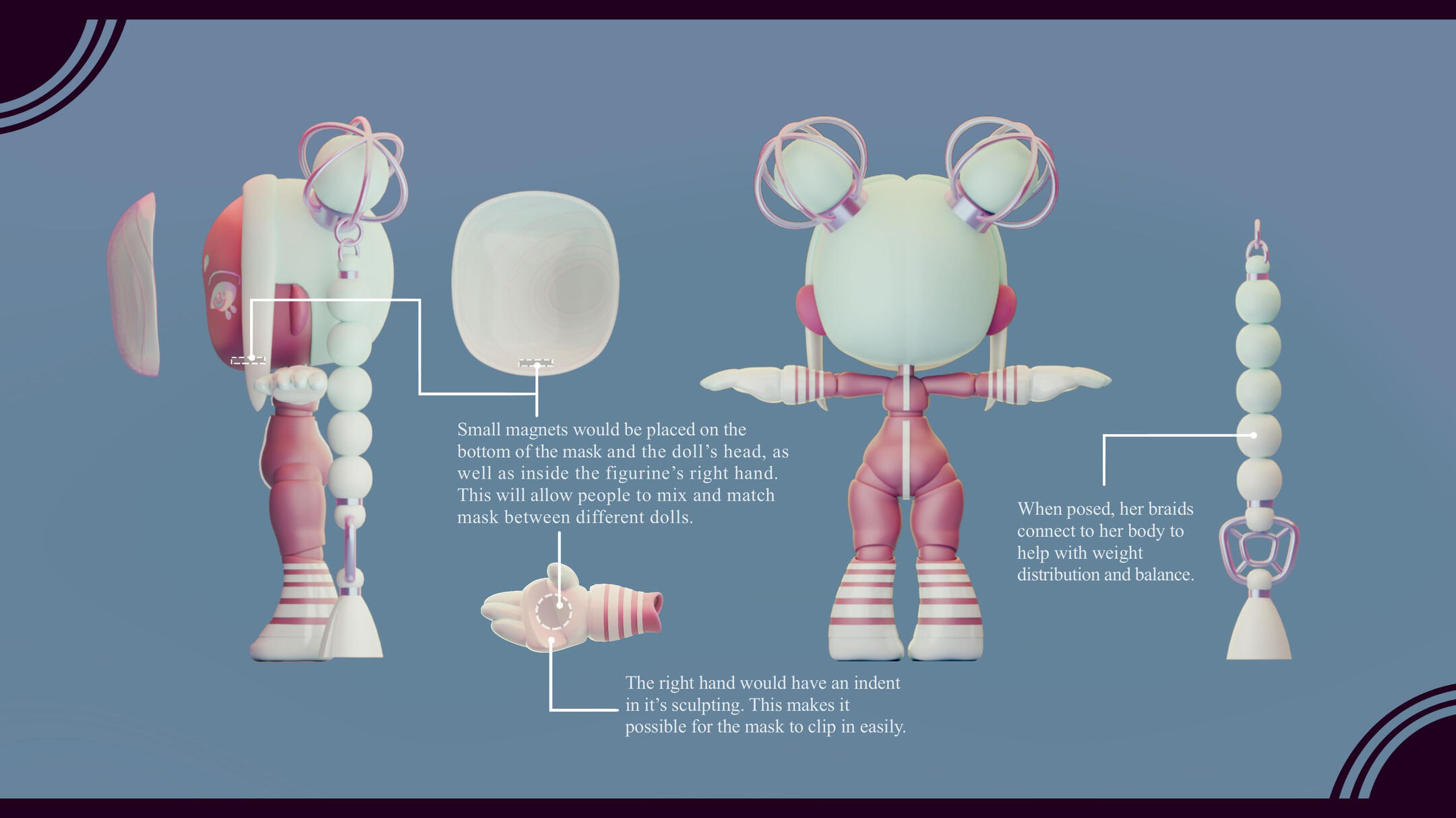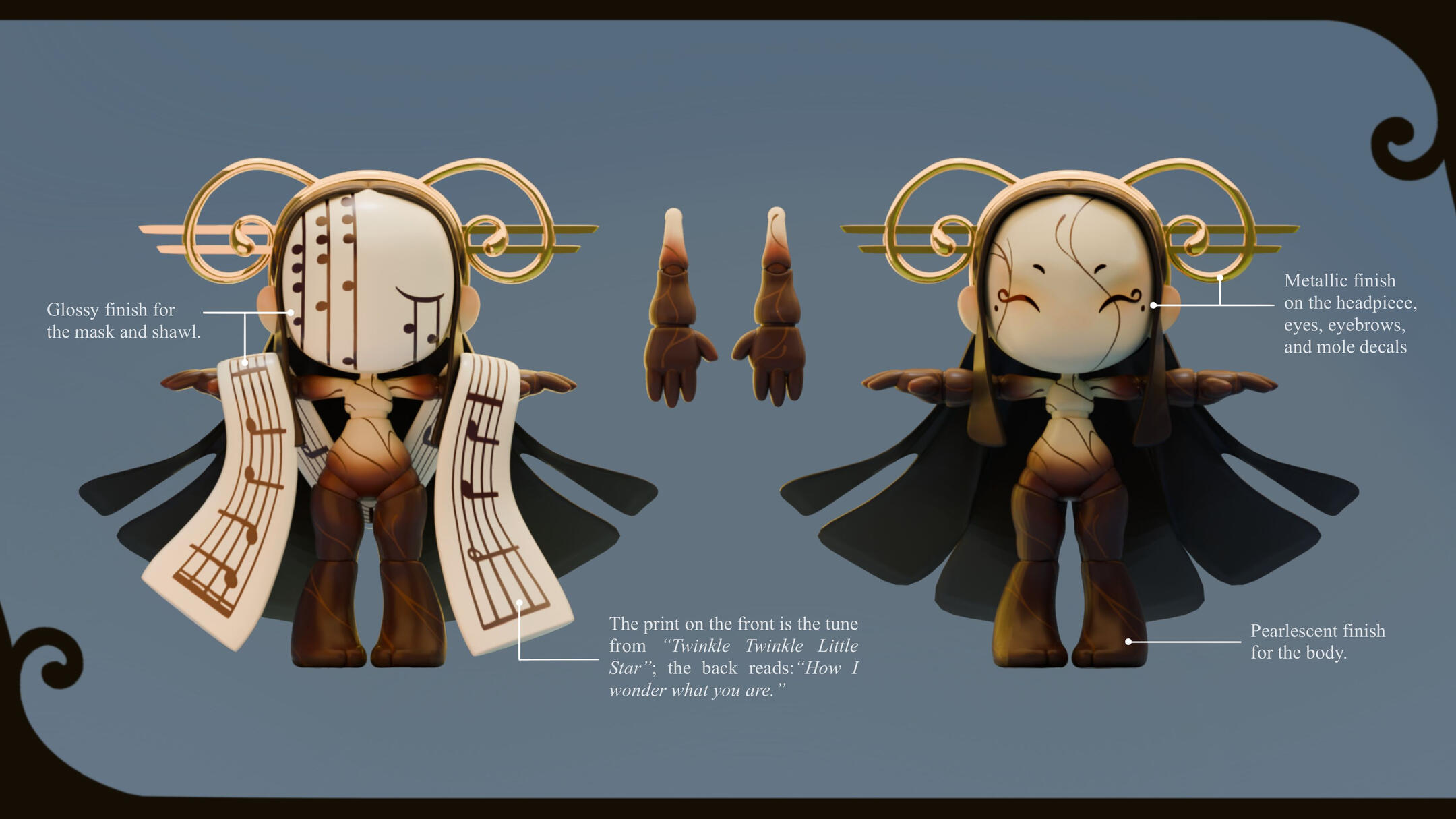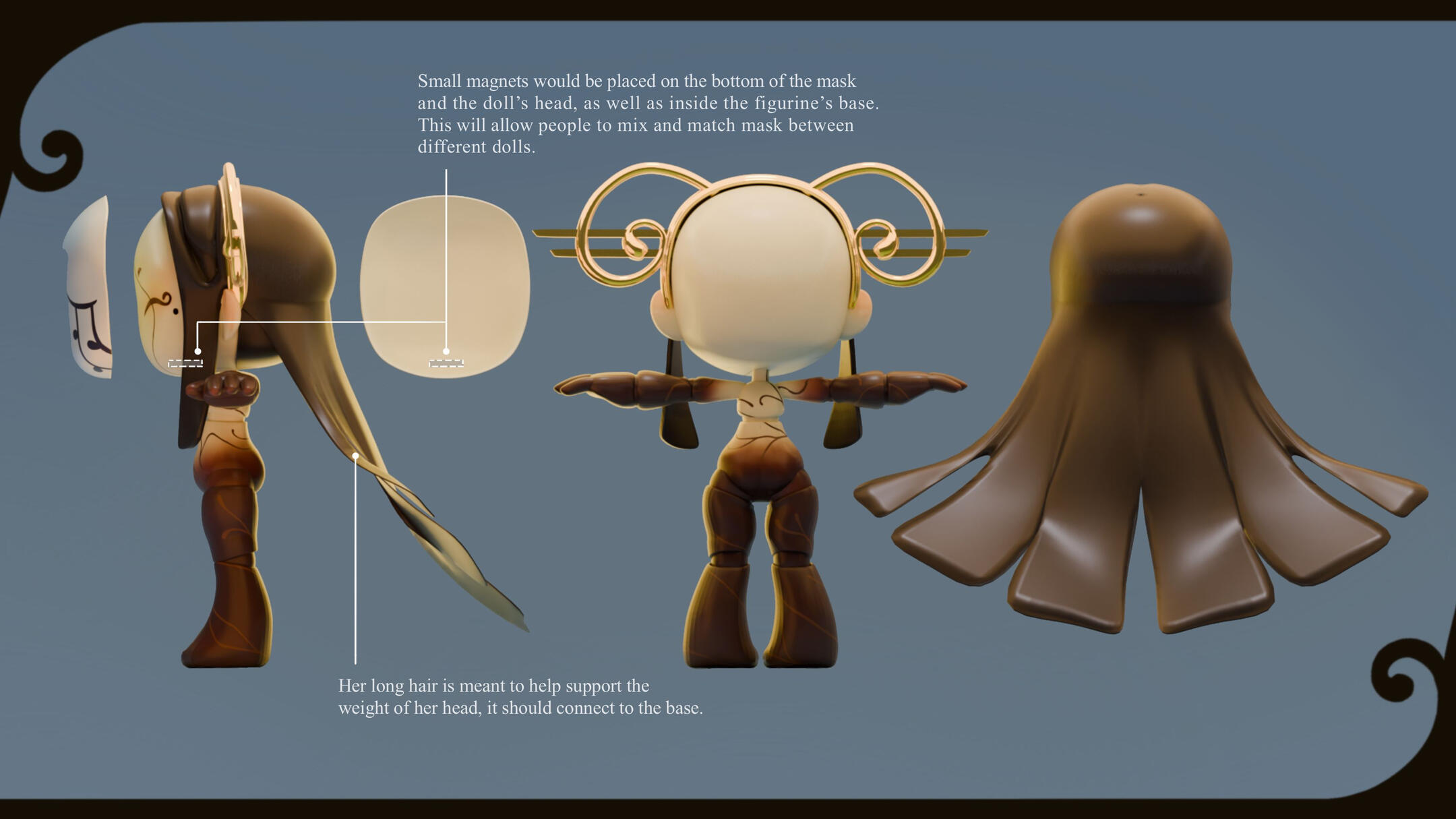Melody, alongside the next doll, was used to figure out the direction we wanted for the set -- and the project in general.We wanted to give this line something that set it apart, something that also played into the "dress up" aspect of playing with dolls; something like... a mask.You would think that having that decided would make the process a lot easier, but it still took a while to figure out how everything else would work. It really wasn't until we stopped focusing on giving her clothing that things started to mesh properly.We saw that with some painted patterns on the body, a head piece, and an accessory or two, we could show off the joints of the doll; while also giving her whatever flavour the theme required.With that, all that was left to do was figure out the details of the design and to make her feel as lightweight as possible. We really wanted it to feel like she being carried by the wind, much like how it feels when you have your head in the clouds.