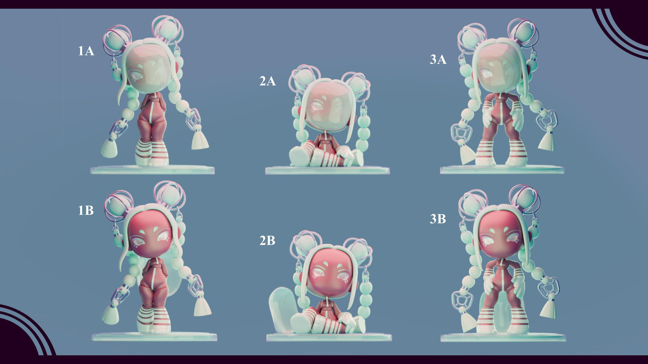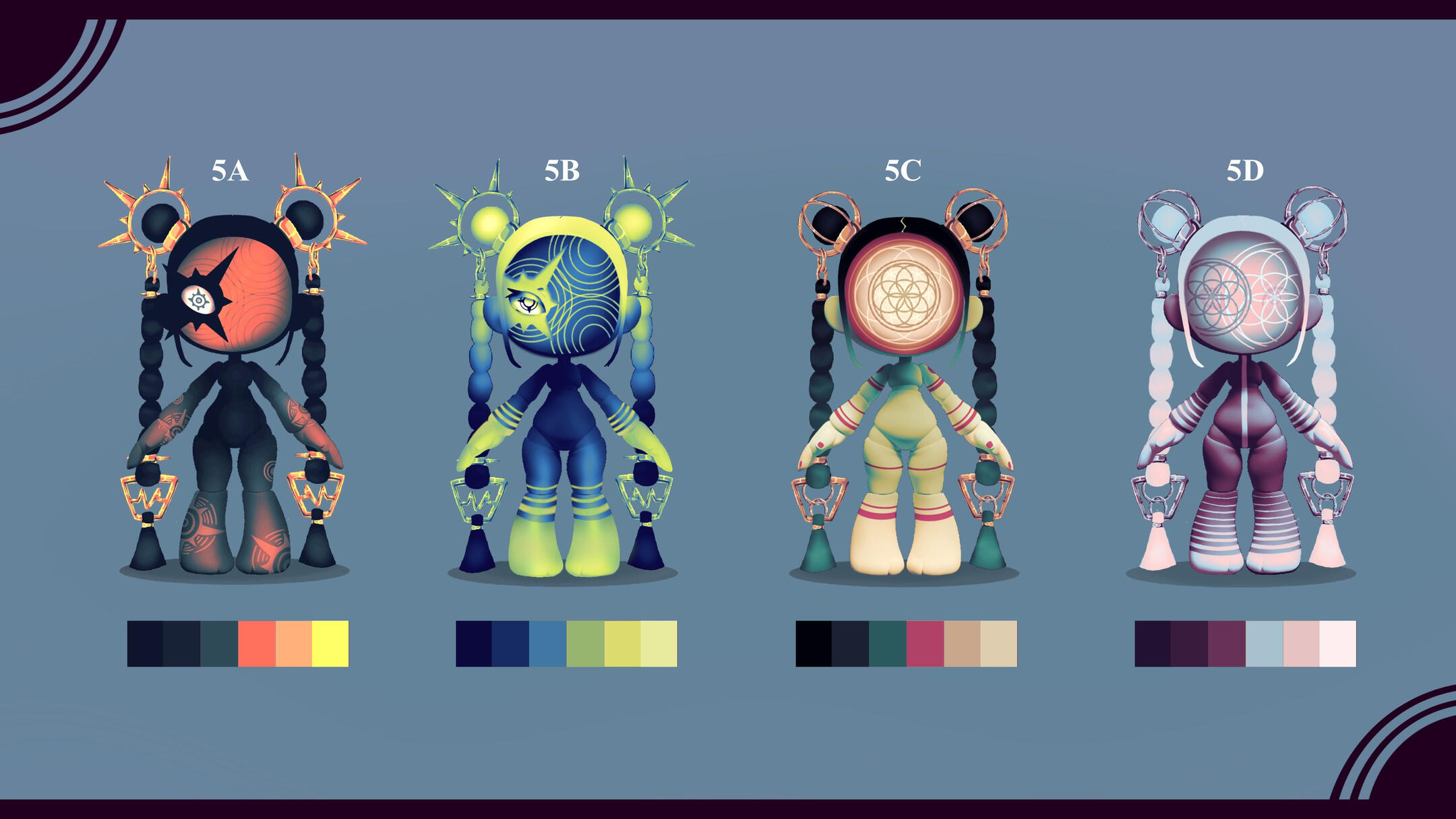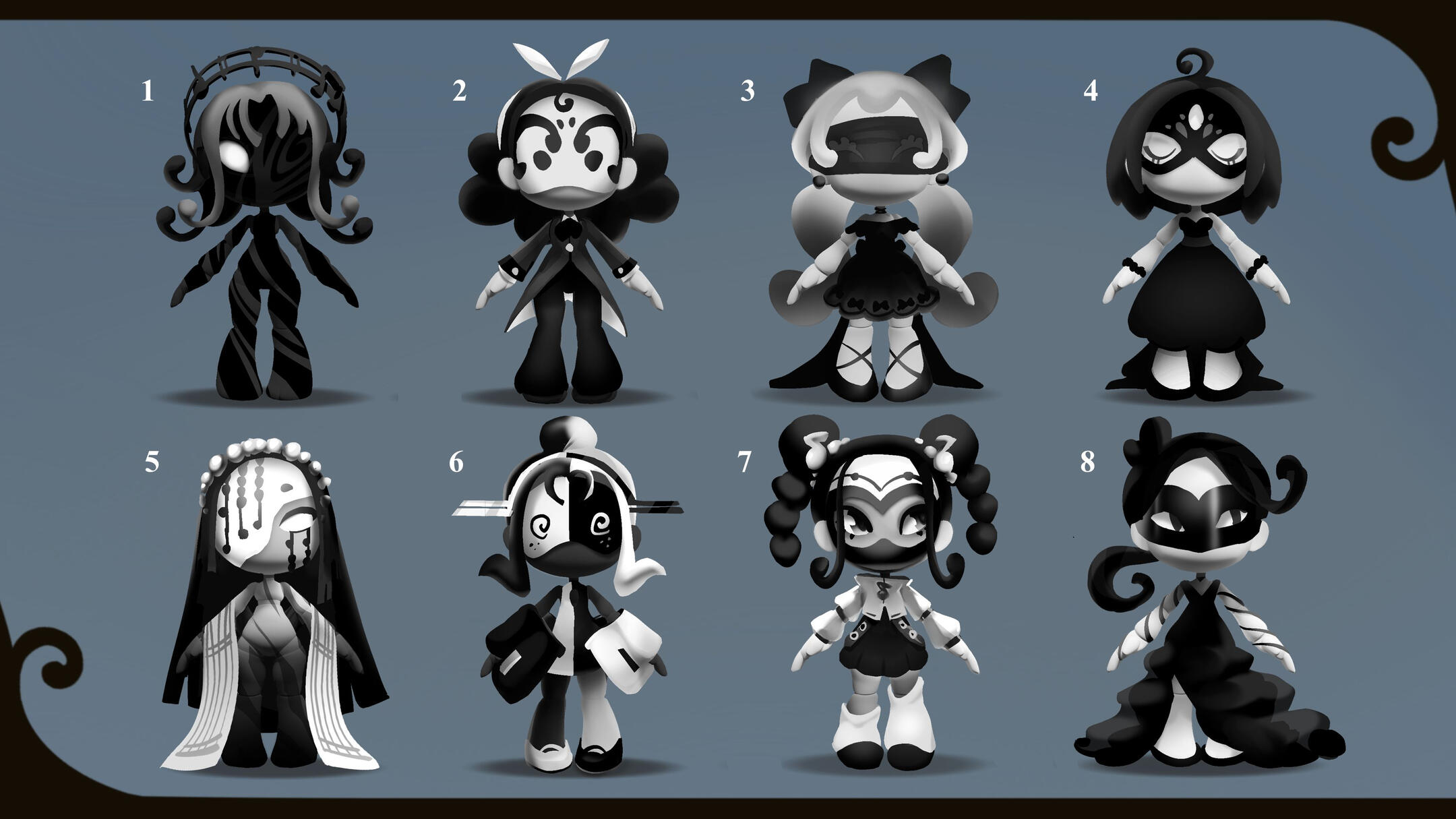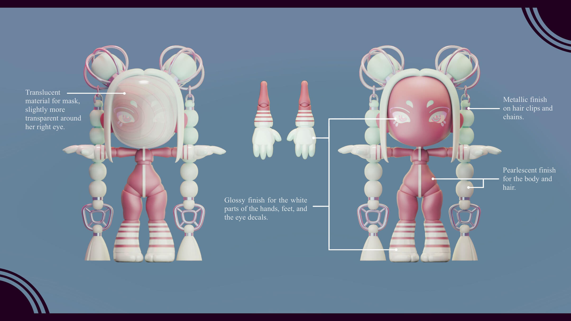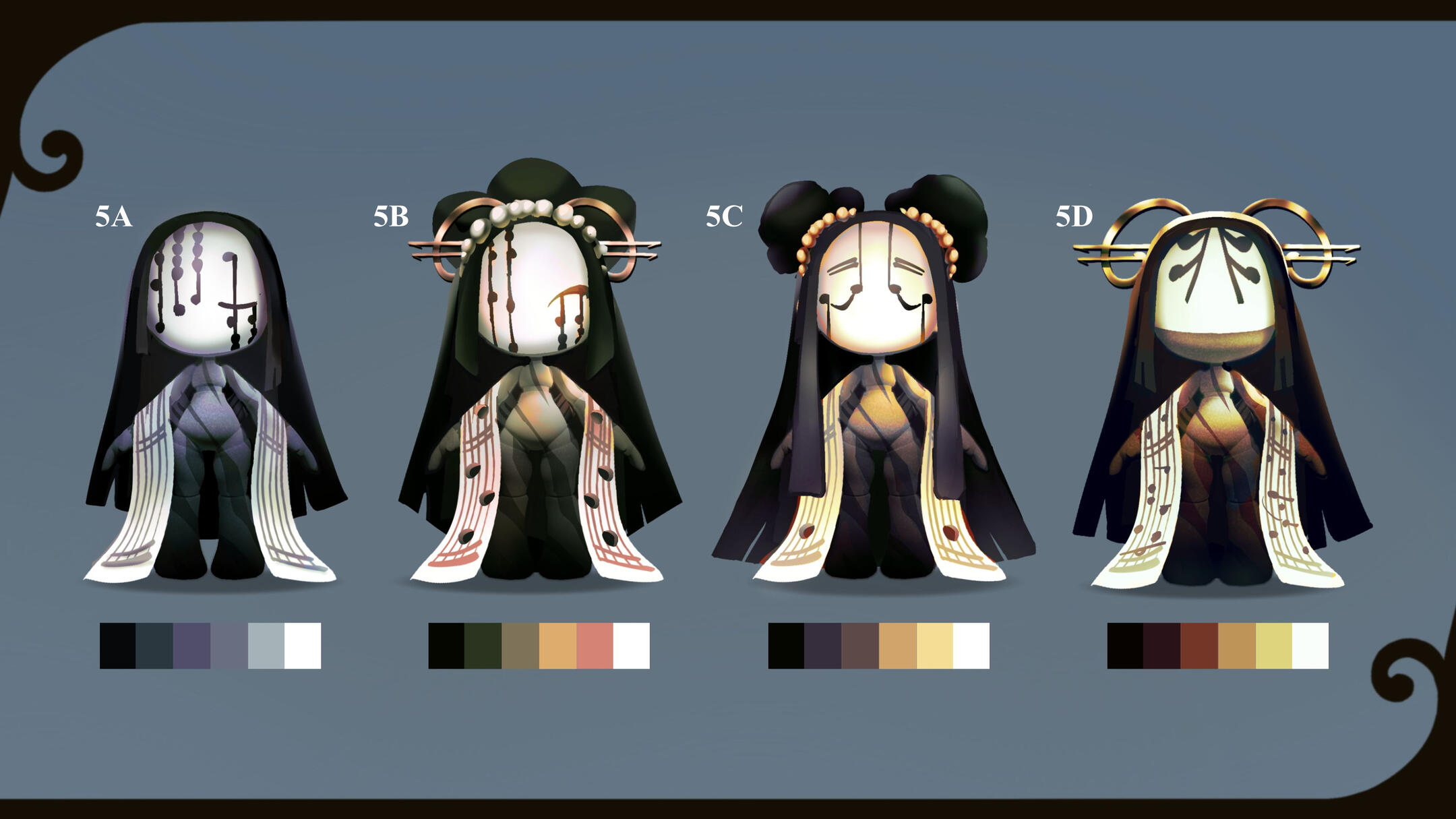 Melody, alongside the next doll, was used to figure out the direction we wanted for the set -- and the project in general.We wanted to give this line something that set it apart, something that also played into the "dress up" aspect of playing with dolls; something like... a mask.You would think that having that decided would make the process a lot easier, but it still took a while to figure out how everything else would work. It really wasn't until we stopped focusing on giving her clothing that things started to mesh properly.We saw that with some painted patterns on the body, a head piece, and an accessory or two, we could show off the joints of the doll; while also giving her whatever flavour the theme required.With that, all that was left to do was figure out the details of the design and to make her feel as lightweight as possible. We really wanted it to feel like she being carried by the wind, much like how it feels when you have your head in the clouds.
